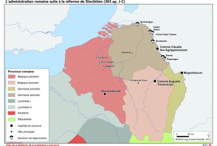 Quand l’empereur Dioclétien (284-305) procède à la réorganisation générale de l’Empire, il distingue désormais, dans la province Belgica, la Belgique supérieure ou première (cap. Trèves), la Belgique inférieure ou seconde (cap. Reims). Quant à la Germanie inférieure, elle est désormais rebaptisée Germania Secunda : c’est là que se situe la civitas Tungrorum traversée en son milieu par la Meuse, entre Dinant et son embouchure. La réforme de Dioclétien semble effective dès 303.