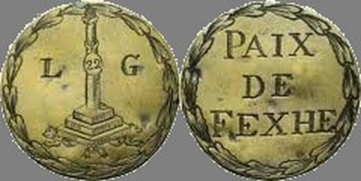 Médaille, s.d. (1789), Plaquette gravée de la révolution liégeoise. Droit : Le perron marqué 22 entre L-G, dans une couronne de laurier. Revers : PAIX/ DE/ FEXHE dans une couronne de laurier.