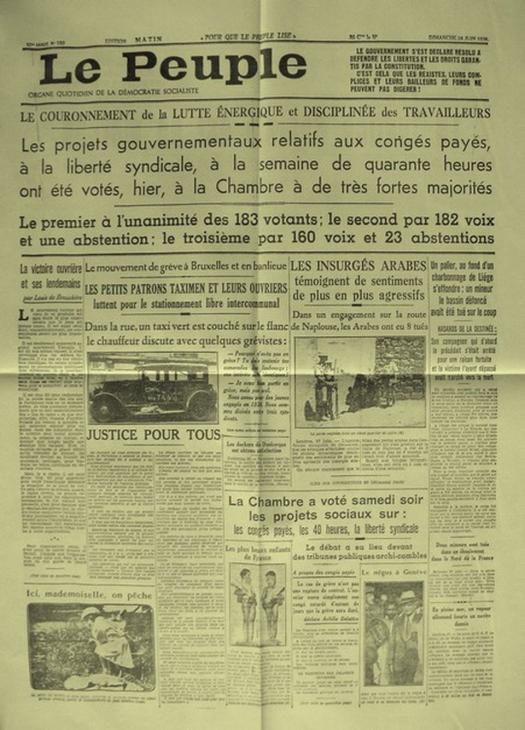 La « une » du journal Le Peuple du dimanche 28 juin 1936 porte essentiellement sur le vote par la Chambre des congés payés et de la liberté syndicale – Diffusion Institut Destrée © Sofam