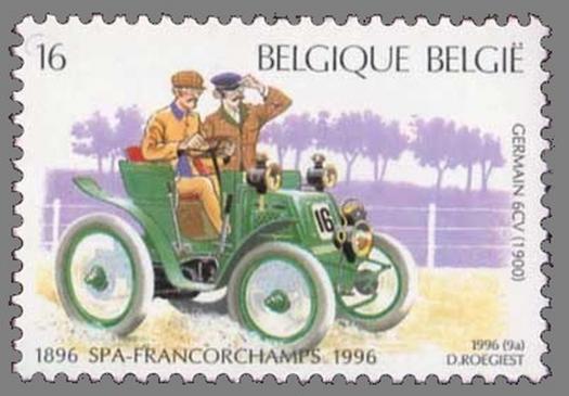 Centième anniversaire des courses automobiles à Spa, timbre-poste belge émis le 29 juin 1996. Hommage à la Germain