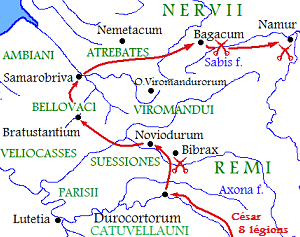 Pro-consul de Gaule en 59 avant J-C, Jules César entreprend une série de batailles contre les tribus celtes ; en 57, il combat dans le pays dit des Belges et soumet les Nerviens, les Atuatiques et les Éburons. Sans que l’on sache très bien s’il s’agit de la Sambre, de l’Écaillon ou de la Selle, le général romain remporte une victoire décisive mais surtout très meurtrière sur la Sabis, face à Boduognat, chef des Nerviens.